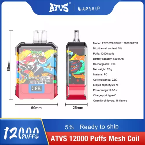 The ATVS WARSHIP 12000 Puffs Disposable Vape is a top-tier, high-performance disposable vape designed for long-lasting use, smooth draws, and rich flavor. With its impressive 15ml e-liquid capacity and 650mAh rechargeable battery, this device ensures you get the most out of every puff. The advanced mesh coil technology offers superior vapor production with intense flavor, making it the ideal choice for vapers who enjoy consistency and quality.